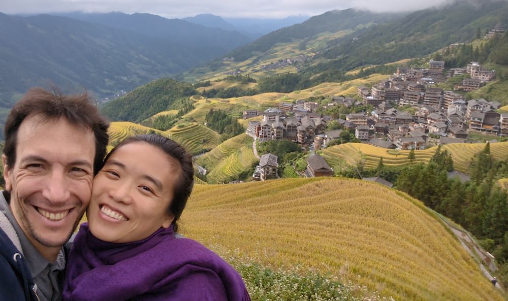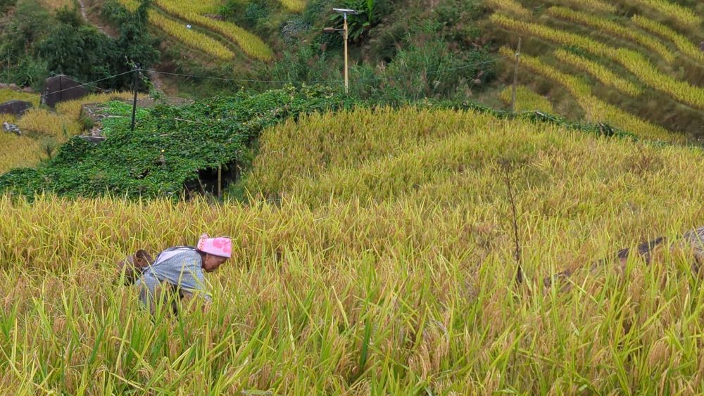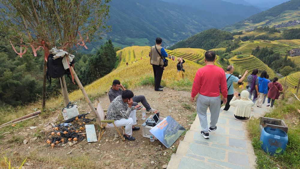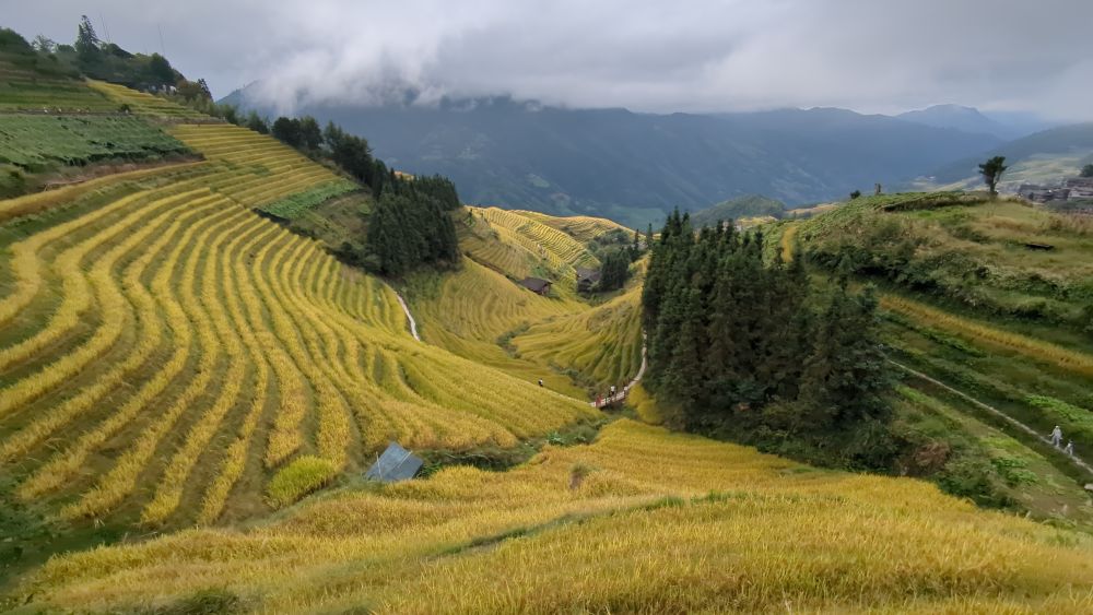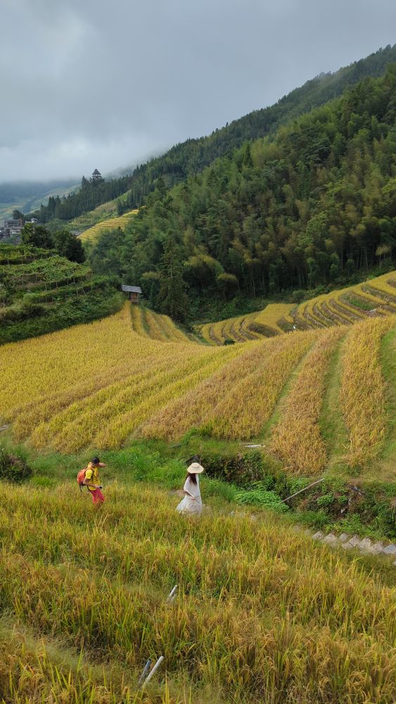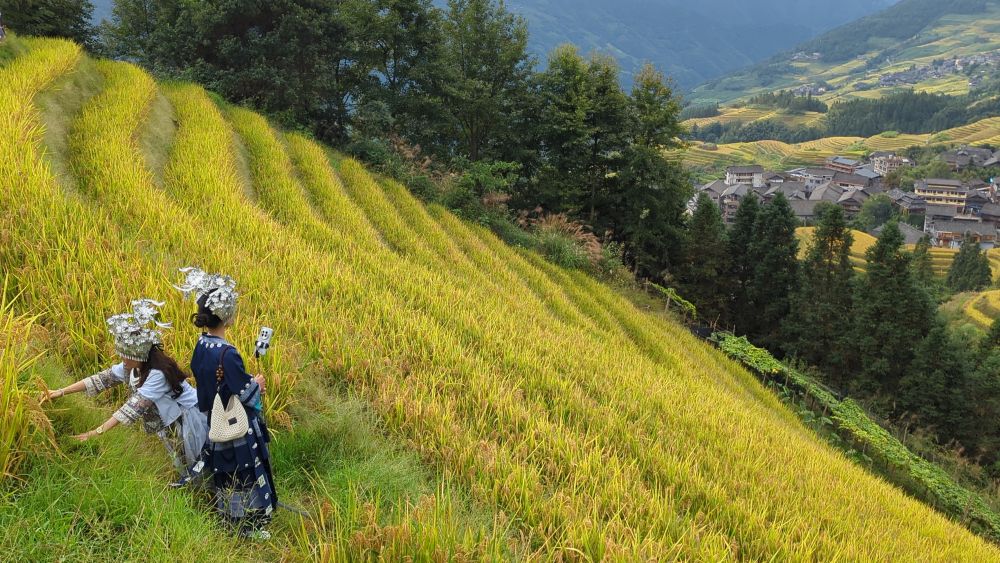 Grande journée de balades dans les très photogéniques rizières de Ping-an. Nous n’étions pas seuls, même si désormais loin de la fête nationale chinois. Car c’est exactement le bon moment pour venir faire des photographies comme les chinois adorent en faire. Nous nous demandons d’ailleurs souvent ce qu’ils en font. Un book ? Instagram ? TikTok ? Comme tout le monde semble faire les mêmes photos, on ne voit pas vraiment en quoi ça peut être intéressant. En tous cas à chacune de nos destinations, les mises en scène en costume d’époque sont de mise. Selon notre guide, ça a explosé depuis la période Covid. Il y a donc partout des femmes (majoritairement) suivies par des photographes au travers des lieux « instagramables » (ou tiktokables ?). Et nous.