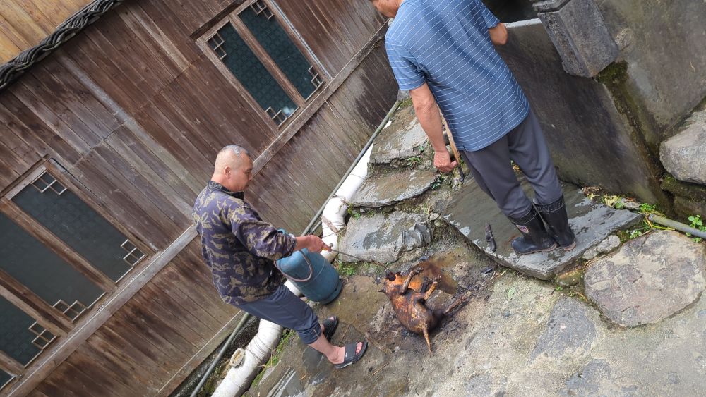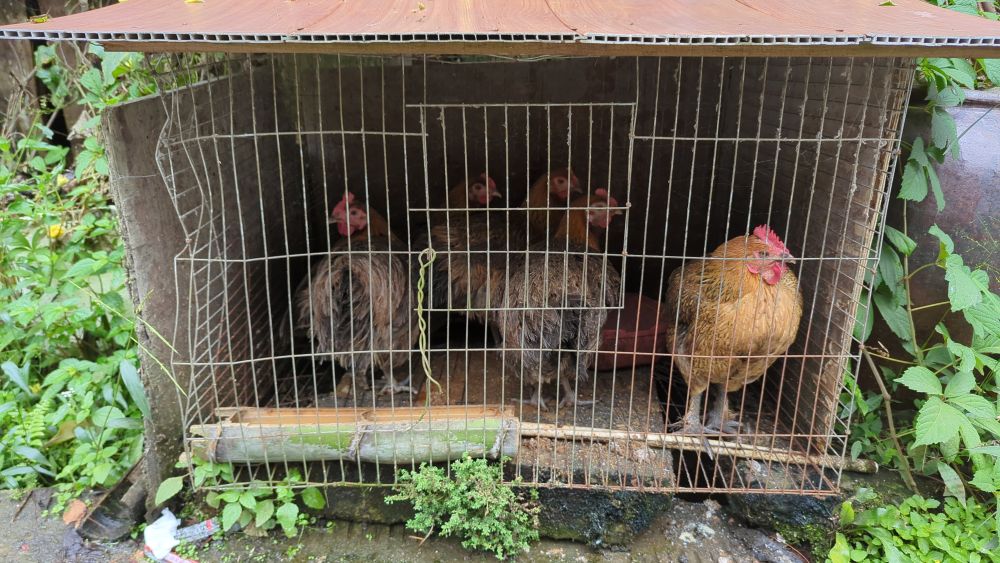 Côté animaux, sous les maisons ou dans un coin de la terrasse de rizière, on retrouve régulièrement des basse-cours, parfois dans des cages un peu trop petites. Et des chats, des fois aussi dans des cages. On tombe même sur la cuisson d’un chien. Les frelons à patte jaune (dits asiatiques sous nos régions) servent aussi à l’effort de guerre en étant macérés dans de l’alcool. Je ne valide pas : je ne ramène pas :/ !